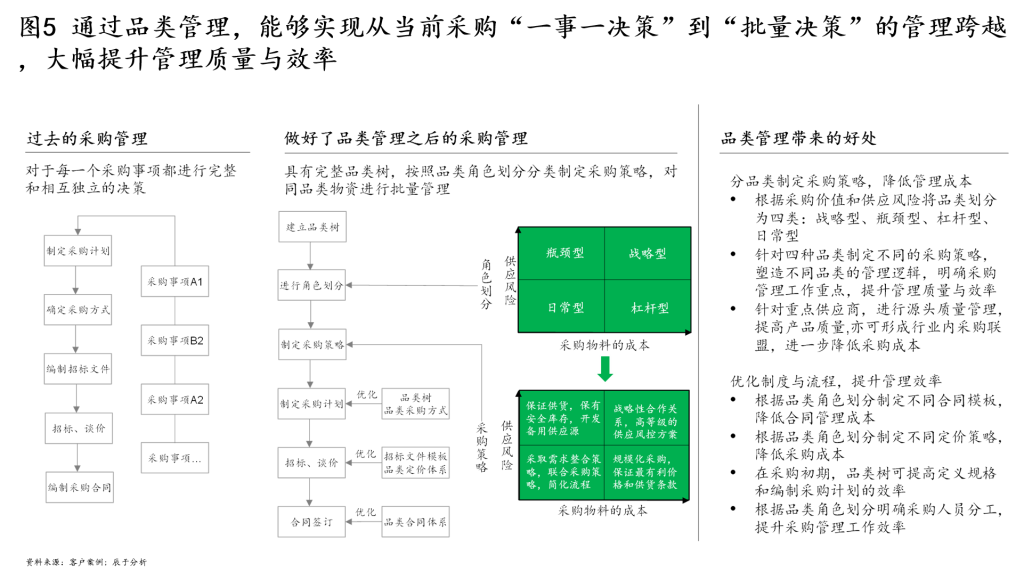 端到端虽然说起来简单,但是要运用到在实际的流程工作中不是那么简单。举一个简单的例子:项目公司日常的生产物资采购申请流程,乍一看,这个流程的发起者是项目公司的采购专员,最终也是采购专员拿到了采购批准,但这个流程的需求者是采购专员吗?很显然并不是。往这个流程的前后追溯,采购专员之所以要采购,是因为生产部门提出了物资的需求,如果不采购,那么为客户的服务将会因此中断,因此这个流程的最大的需求者其实是客户。这时候就有必要来反思这个采购申请流程的必要性了,采购申请流程为客户带来价值了吗,至少没有看到直接意义上的价值,那么又是为谁带来了价值?答案可能是股东/管理层或者政府——为了控制不必要的浪费、控制采购的价格,为了使采购合规,因此添加了这个流程,股东和政府成为了这个流程的第二、第三需求方。但是很明显,这个流程不仅打破了客户到客户的端到端,还没有实现股东到股东的端到端,这就说明企业在纵向上(如果业务流是横向的话)的流程建设并不完善,企业真正应该做的事情其实是要做好从采购品类管理、采购计划管理、供应商管理这条流程上的事情,如果企业管好了供应商,管好了合同,管好了品类,采购申请这个流程自然就会消失了(见图5)。