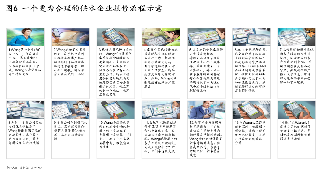 在第一个环节——战略到流程中,战略实际上确定的是业务,业务将会对应着一个客观存在的业务流,寻找到这个客观存在的业务流是非常重要的。例如,供水企业客户投诉处理的流程,由于客户投诉内容的紧急性有别,企业需要判断紧急性来进行优先级排序,有的企业可能并不是以客户为出发点来判断,而是根据问题的技术难度来判断,比如处理起来要耗时多久、成本几何,不仅内部各部门之间难以达成一致,而且客户的满意度还难以提升。这个流程更加合理的做法是:以客户为出发点,关注该问题对客户实际影响的程度大小,比如影响了多少人,多大面积,多长时间这些指标来判断,这样的流程才能走的顺畅,才不会偏离方向,才能将业务流正确的分解为一个个任务(见图6)。