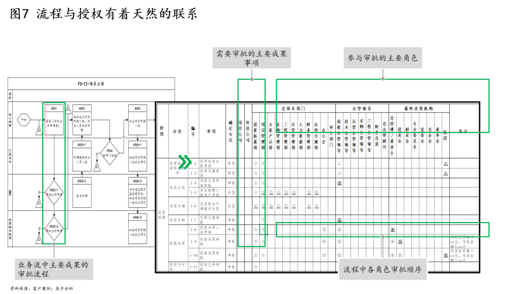 伴随着组织出现的,就是责权的分配,或者更直接的说法是授权(见图7)。流程的授权可以分两个维度:一个是基于组织的划分进行分段流程的授权,将流程的控制权授予某个组织,使其对流程的执行质量、效率等把关,比如工程质量管理的流程,授权于工程管理部进行管理;一个是基于专业领域的授权,对流程输出成果进行专业性的管理,例如将工程设计图的审批授予设计管理部。