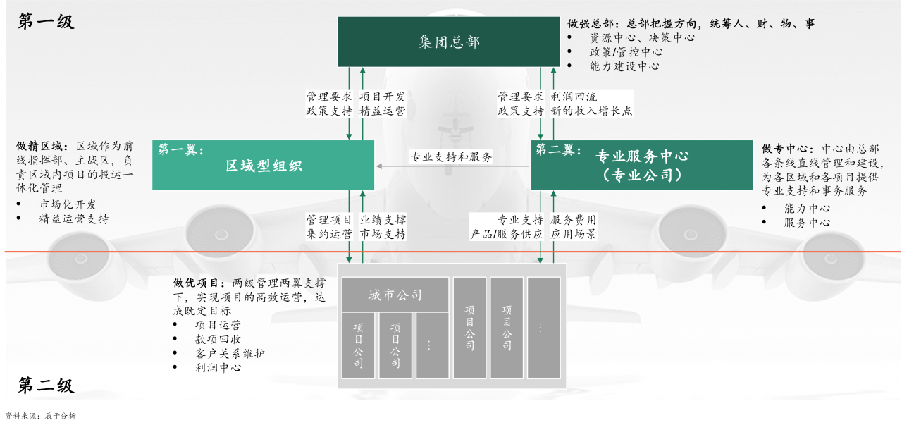 “两级两翼”3.0架构对各级组织的定位是“做强总部、做精区域、做专中心、做优项目”。“两级两翼”架构就好比飞机,总部是机头,项目是机身,“区域”和“中心”是两翼,机头是资源的调度者、指令的发布者、方向的控制者,两翼是动力的提供者、升力的承载者,机头越强、动力越足,就能驱动更大、更重的飞机翱翔(如图所示)。