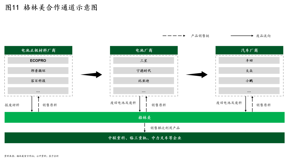 其二是线下回收体系协同。回收体系可与原材料资源整合,为新能源生产提供稳定的资源渠道。格林美与630多家整车和电池厂商签署了回收合作协议,形成动力电池回收业务的“2+N+2”模式。