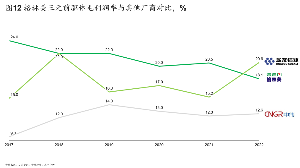 正因为格林美对上游原材料和下游销售端的深度参与,格林美的三元前驱体业务获得了比竞争对手更稳更高的盈利水平,过去五年,格林美这项业务的毛利率基本稳定定在20%左右,除了2022年,均高于另外两家主要竞争对手(见图12)。
