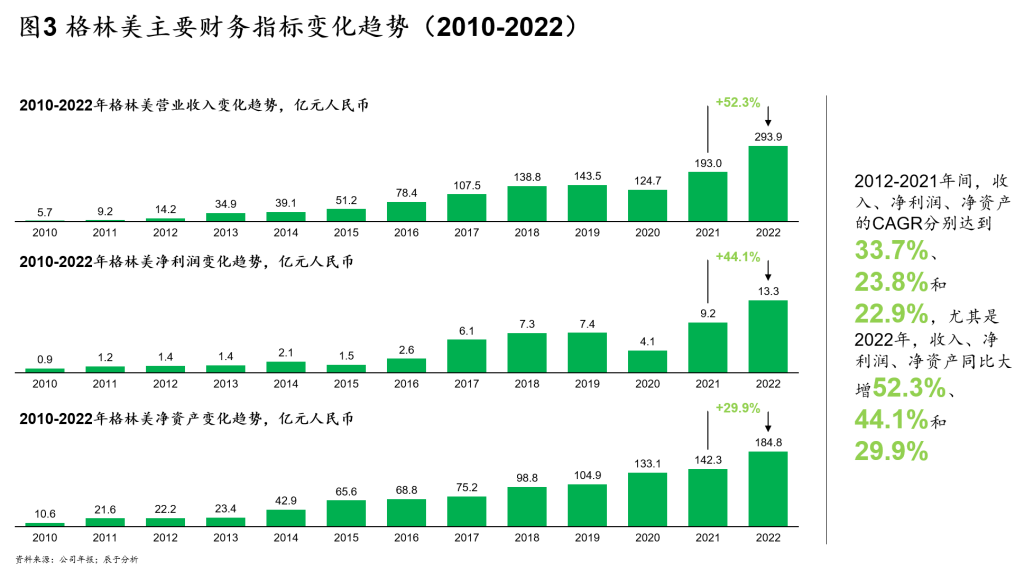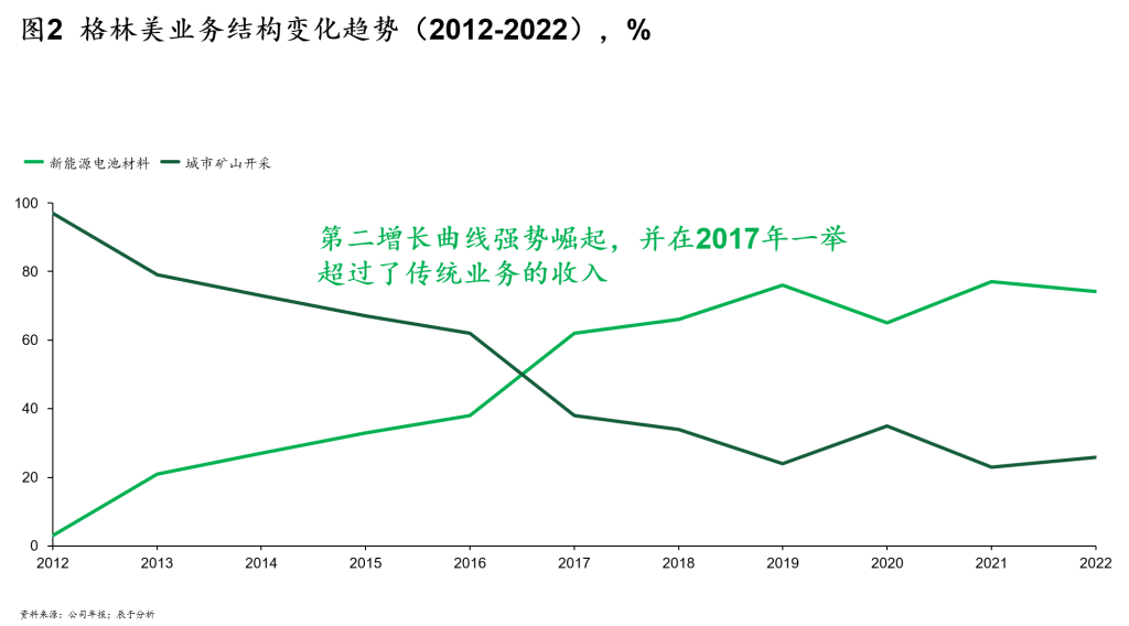 从2001年以废旧电池回收起家,到2012年收购江苏凯力克转型跨入新能源电池材料行业,再到2017年新能源电池材料制造业务收入一举超过传统废弃资源综合利用业务,直至2022年实现近300亿元同比大增52.3%的收入规模,历经二十多年的快速发展,格林美已经成为中国资源循环利用及新能源电池材料领域的头部企业。展望未来,格林美将继续以镍原料资源为底盘,全面实施“新能源材料制造与城市矿山开采”的双业务发展战略,加速提升全球竞争力,推动公司各项业务的规模和效益持续提高。