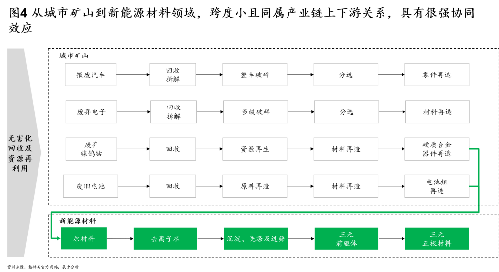 从城市矿山到新能源电池材料,两者的领域跨度小,同属于产业链的上下游关系,具有很强的协同效应(如图4),具体体现在: