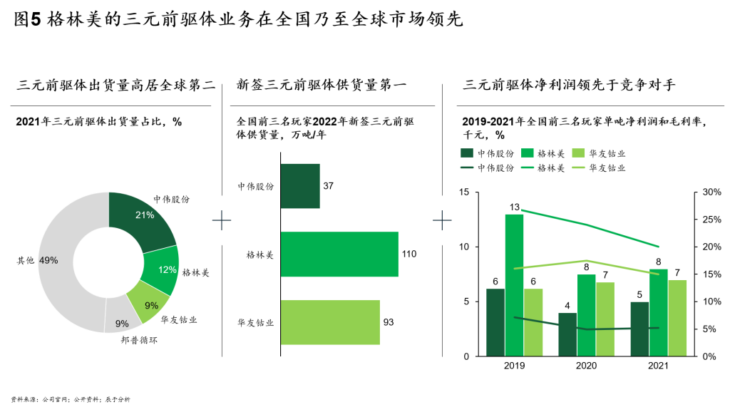 以三元前驱体为例,在2021年出货量占据全球市场12%的基础上,2022年新签三元前驱体供货量110万吨,全球第一,明显高于华友钴业的93万吨和中伟股份的37万吨。不仅如此,格林美三元前驱体的净利润和毛利率水平,也领先于这两家主要竞争对手(见图5)。