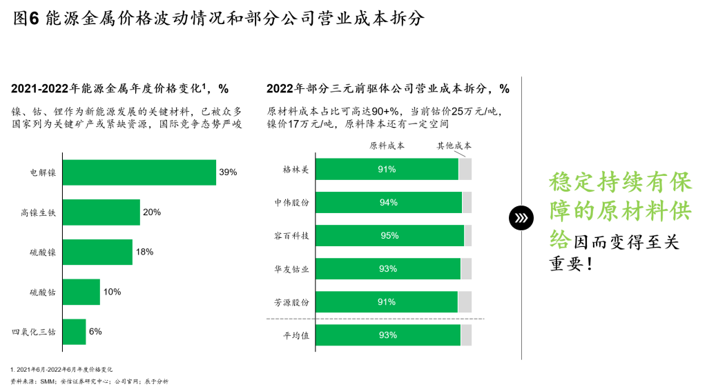 上游环节,三元前驱体的原材料主要是镍、钴、锂等能源金属和化合物等,价格波动很不稳定,例如电解镍2021.6~2022.6期间的价格变化达到39%,高镍生铁和硫酸镍的变化将近20%,硫酸钴的变化近10%;此外,这些原材料成本在三元前驱体公司的总成本中占比很高,基本超过90%。稳定、持续且有保障的原材料供给因此变得至关重要(见图6)。