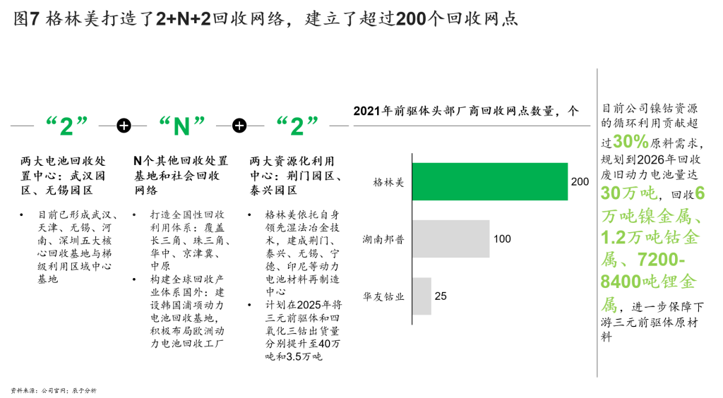 在原材料回收环节,格林美打造了“2+N+2”回收网络,建立了200多个回收网点,扩大原材料的回收范围,同时也加大力度提高镍钴资源的循环利用效率(见图7)。