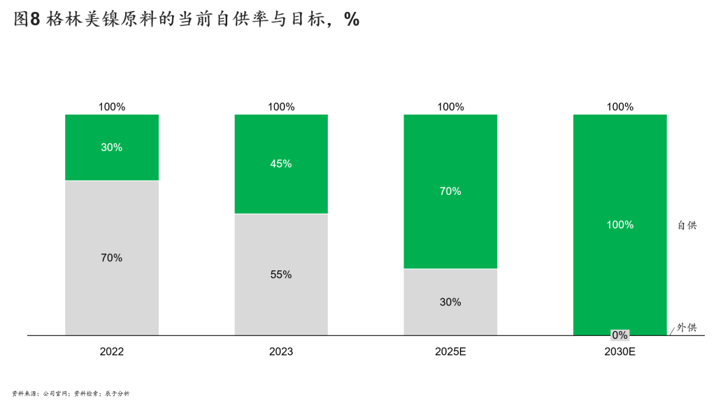 通过原料开采端与回收端的两端发力,格林美保障了三元前驱体的原材料供应。目前新能源市场处于快速增长期,原矿资源作为补充能够保障当前市场需求,等新能源市场到了存量市场,更多的资源将来自于回收端。目前,格林美镍原料的自供比例在 40%-50%,目标是到2027年-2030年实现100%镍自供率(见图8)。